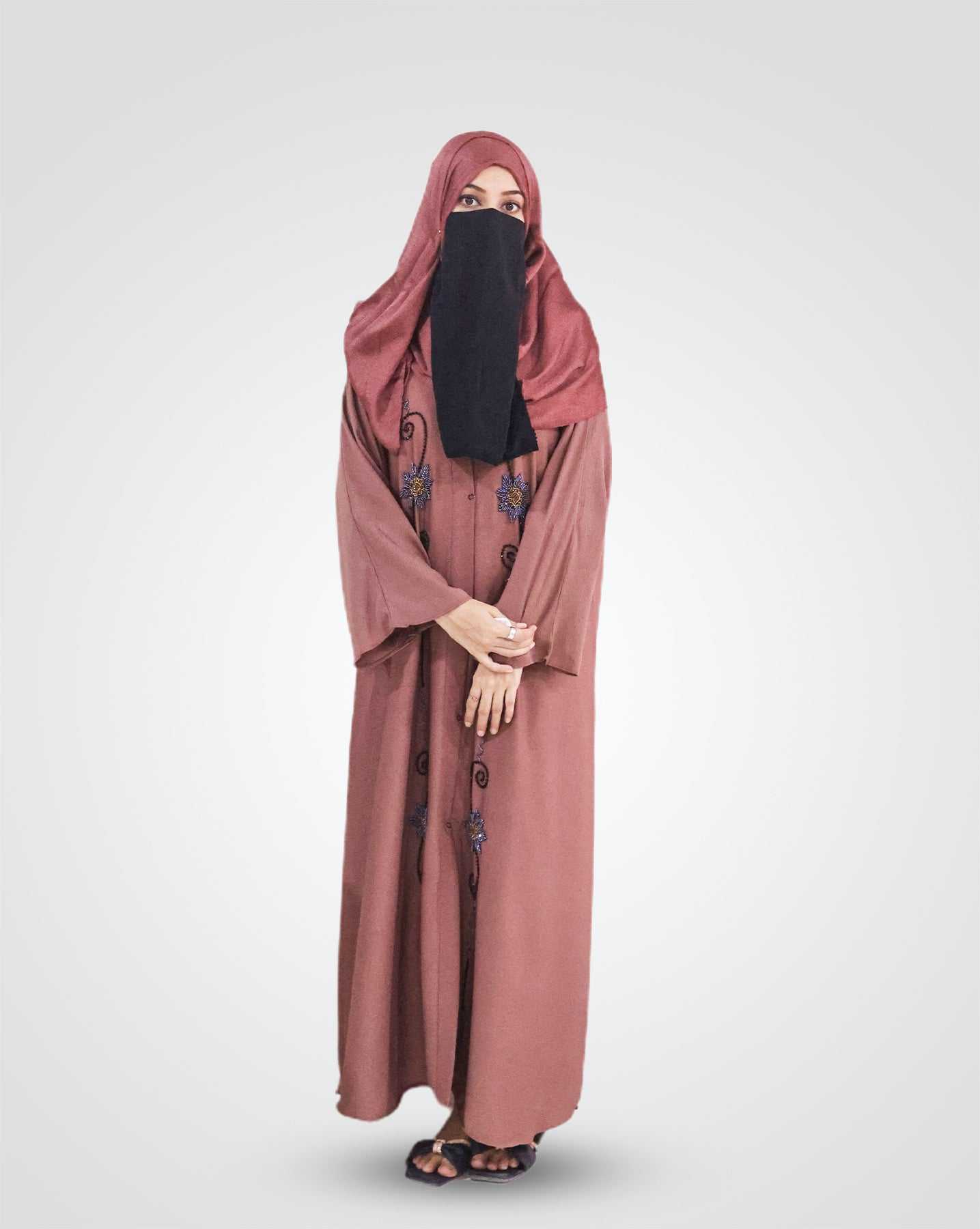 Elevate your modest fashion collection with this stunning Georgette Embroidered Full Abaya in rich maroon. Crafted from premium georgette fabric, this classic piece features intricate front bow embroidery that adds contemporary elegance to traditional wear. With a generous 100+ flare and 55-inch length, it offers graceful movement and complete coverage. The 23-24 inch chest measurement ensures a comfortable fit for most body types. Perfect for daily wear or special occasions, this abaya combines timeless sophistication with modern design details. Each piece is carefully tailored to deliver quality and style that reflects your refined taste in Islamic fashion.